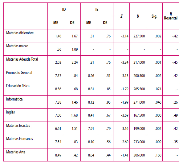 Para evaluar la existencia de diferencias estadísticamente significativas en las calificaciones de los alumnos entre la condición de ID y la condición de IE, se realizó una prueba de comparación U de Mann-Whitney. Se optó por dicho estadístico puesto que los valores obtenidos por los grupos en las distintas variables no cumplían o bien con el criterio de homogeneidad o bien con el criterio de homocedasticidad. El tamaño muestral también sugiere la utilización de pruebas no paramétricas. Consecuentemente, el tamaño del efecto fue calculado mediante la R de Rosental, más adecuada que la d de Cohen para las distribuciones que no se ajustan a la distribución normal.