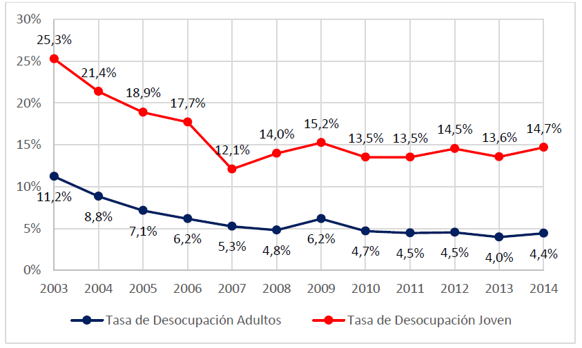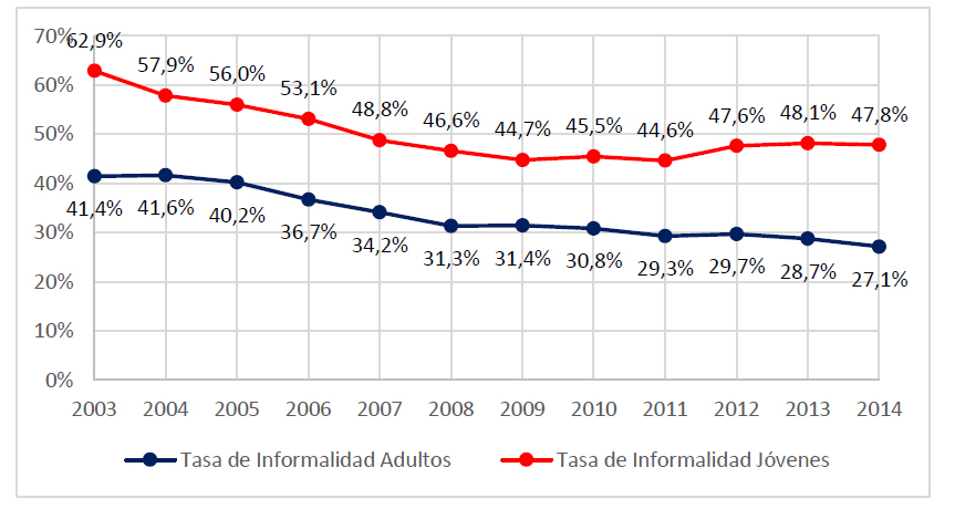 Para el mismo periodo, los indicadores laborales juveniles revelaron algunas mejoras. Sin embargo, a pesar de que las tasas de desempleo e informalidad laboral juvenil descendieron persistió el lugar deteriorado del empleo joven frente al empleo de adultos (Jacinto y Chitarroni, 2010; Miranda, 2008; Salvia, 2008). En 2014 cerca de la mitad de los jóvenes asalariados son informales y el desempleo juvenil triplica al desempleo de adultos, constituyendo así a los jóvenes como una población vulnerable (ver Gráficos 1 y 2 del anexo).