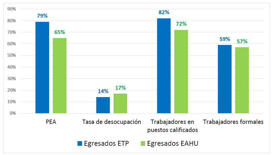 Además los egresados ETP muestran ventajas relativas respecto a los egresados EAHU en tanto se ven algo menos afectados que estos últimos por la desocupación y la informalidad (ver Gráfico 4 del anexo).