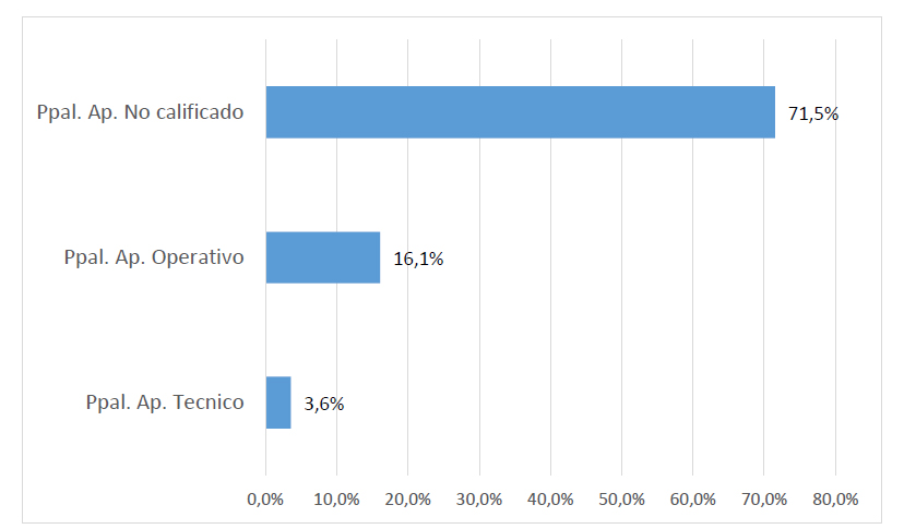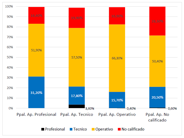 En cuanto a la calificación el 18% de los egresados ETP evidenció movilidad ocupacional ascendente respecto al principal aportante de su hogar. Se observa (ver Gráficos 5 y 6 del anexo) que el grupo donde resulta más notable es en el de los egresados pertenecientes a hogares cuyo principal aportante es un trabajador que se desempeña en un puesto no calificado, ya que casi 7 de cada 10, se encuentran trabajando en puestos de calificación superior. También se verifica movilidad ascendente en cuanto a la calificación entre los egresados pertenecientes a hogares cuyo jefe se desempeña en un puesto de calificación operativa o técnica.