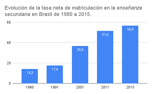 La generalización del acceso a la escuela secundaria recién se produjo en Brasil en la década de 1990, como resultado de las políticas educativas del período de apertura (1982) rumbo a la democracia en el país (1985), a través de las cuales se intentó reducir la deserción escolar. Hasta entonces, había dos problemas distintos en ese momento, el acceso a la escuela, sobre todo en las pequeñas ciudades y en las grandes zonas rurales, y luego los que lograban entrar en la escuela se enfrentaban a múltiples reprobaciones que generalmente los desalentaban a seguir en la escuela. Gracias a las políticas iniciadas en la década de 1980 para reducir la repetición en la escuela primaria, el número de jóvenes que pueden acceder a la escuela secundaria aumentó a partir de los años de 1990 (Gráfico 1).