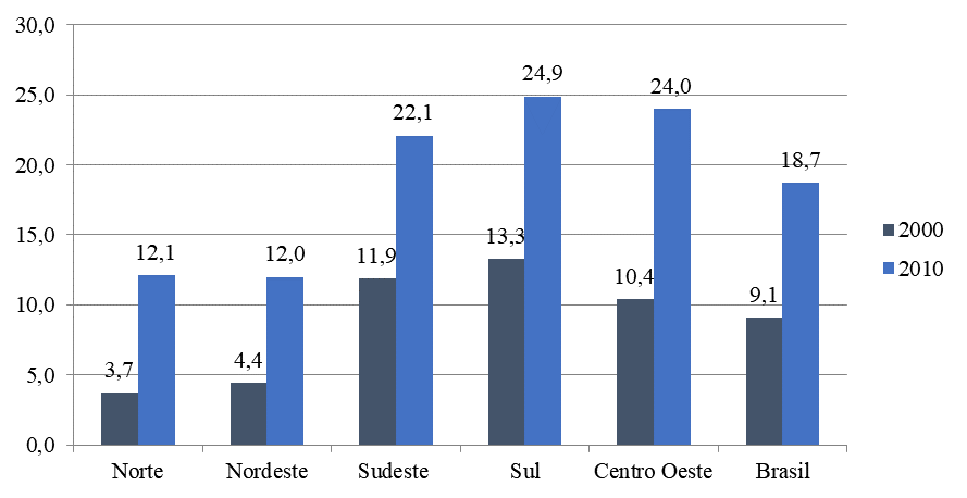 El gráfico 2 muestra cómo las regiones económicamente más ricas tienen tasas mucho más altas que las regiones del norte y del noreste. La investigación realizada por el Instituto de Investigación Económica Aplicada (IPEA) describe bien la segunda ola de crecimiento de la educación superior, entre 2000 y 2010 (Corbucci, 2014) cuando la proporción de jóvenes matriculados en el país, entre 18 y 24 años de edad, aumentó del 9,1% al 18,7%. Si en 2014 hay una tasa neta de matriculación en la educación superior de 17,6%, cuando observamos las mismas tasas por estados de la federación vemos mejor las variaciones de norte a sur del país.