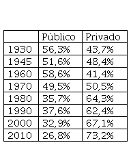 En el caso brasileño, el carácter inclusivo del sistema educativo tardó en desarrollarse. Las tasas de escolarización superaron a las de analfabetismo sólo a partir de los años 60. Según Durham y Schwartzman (1992), en 1950 la tasa de escolarización de la población era del 36,2% y la tasa nacional de analfabetismo del 50%. En 1960, el analfabetismo se redujo al 39% y la escolarización de 7 a 14 años alcanzó el 45,5% de los niños de esa edad. En 1970, la tasa de escolarización en este grupo de edad era del 67,1% y el analfabetismo del 33%. A partir de 1980, la tasa de matriculación en este grupo de edad alcanzó el 80% de los niños hasta que se generalizó por completo en 1990. Esta situación limitaba mucho la población interesada en los cursos de secundaria y, por lo tanto, en la enseñanza superior.