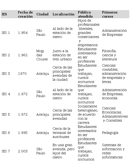 Desde la investigación de campo, las entrevistas y las imágenes de las IES con la comparación sistemática de la génesis y sus propiedades sociales revelan la relativa heterogeneidad de la oferta de enseñanza superior privada. Las imágenes que aparecen a continuación proceden de instituciones privadas de enseñanza superior de São Paulo visitadas durante la investigación de campo. Reflejan las grandes distancias que oponen el universo de los establecimientos privados destinados a las élites y los destinados a los estudiantes trabajadores. También reflejan otras subdivisiones señaladas por la literatura, como las IES que ofrecen cursos tecnológicos, licenciaturas y grados. El cuadro comparativo permite recuperar aspectos decisivos de su historia como el año de fundación, su ubicación en la ciudad y la oferta de cursos con la que iniciaron su actividad.