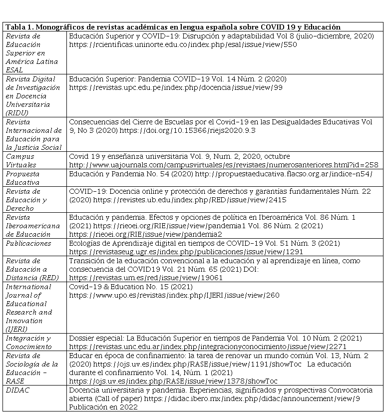 Finalmente es recomendable consultar lo publicado en lengua española en los números monográficos de revistas académicas. La tabla 1 ofrece un listado o inventario de números monográficos dedicados a la Covid 19 en la enseñanza superior en diversas revistas académicas del ámbito iberoamericano.