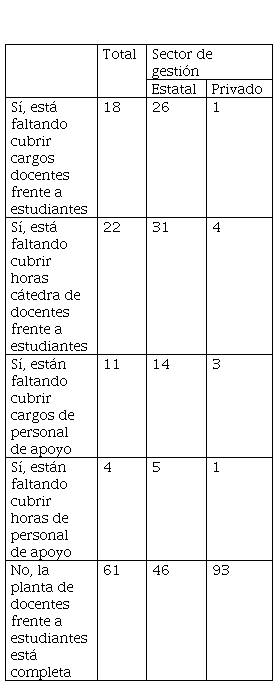 En la encuesta a directivos del 2021 se consultó acerca de la cobertura de las plantas de personal. La situación se visualiza con claridad en el cuadro 6. En el sector estatal existe un porcentaje significativo de cargos y horas sin cubrir, que en términos relativos lo posiciona en desventaja respecto del sector privado. Las causas de esta situación pueden ser variadas, y no es objeto de este trabajo analizarlas, pero es un aspecto que incide en las capacidades institucionales, así como también en el trabajo de los estudiantes al tener mayor o menor circulación de docentes diferentes.