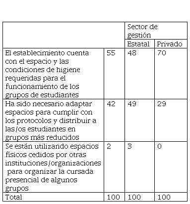 La encuesta a directivos indagó sobre las condiciones en que se encontraban las escuelas para garantizar el cumplimiento del protocolo de regreso progresivo a las clases presenciales establecidos por las autoridades jurisdiccionales. La gran mayoría de los directivos de escuelas privadas, el 70%, respondió que el establecimiento contaba con el espacio y las condiciones de higiene requeridas para el funcionamiento de los grupos de estudiantes, frente al 48% del sector de gestión estatal. El 49% de los equipos directivos de escuelas estatales señalaron que fue necesario adaptar espacios para cumplir con los protocolos y distribuir a las y los estudiantes en grupos más reducidos, frente al 29% de sus pares del sector de gestión privada.