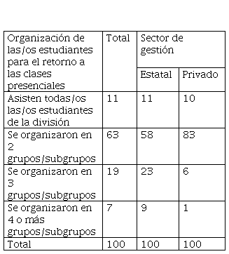 The article's main argument maintains that the interruption of face-to-face schooling and its rearrangement expanded the context of transmission (spaces and temporalities of school education) and altered other principles that regulate pedagogical communication. Consequently, the institutional conditions of the state or private sector unit would be the result of the combination of the organization of supply's attributes, those of the population served by each sector (socioeconomic level) and those related to the schooling trajectory.