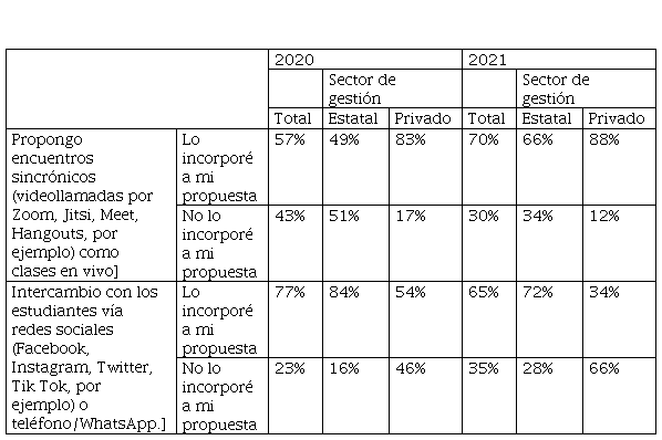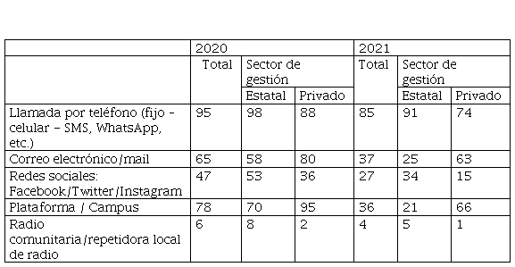 Durante la pandemia las vías de comunicación con estudiantes y los entornos de trabajo con los cuales se dio continuidad a la actividad escolar fueron de gran relevancia (Di Napoli, 2022; Dussel, 2022; Linne, 2021; 2022). Este tema formó parte del estudio realizado, particularmente en la comparación entre la primera toma de la encuesta realizada en 2020 y la segunda en 2021. Se pudieron identificar diferencias por sector de gestión, que, como se destacó en la primera sección del artículo, no están directamente asociadas al carácter administrativo de la clasificación, sino a otros aspectos que configuran una relación compleja entre las características institucionales, las condiciones y el perfil de los docentes y estudiantes. Estos aspectos dan cuenta de la configuración del contexto de transmisión en pandemia, vinculados a los modos de la comunicación pedagógica, a las relaciones entre las escuelas y los hogares, a las disponibilidades y tipos de recursos en los diversos espacios involucrados y de los actores intervinientes, así como a la organización del trabajo en la vuelta a la presencialidad en 2021.