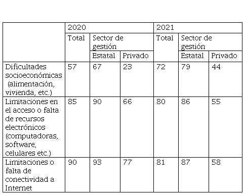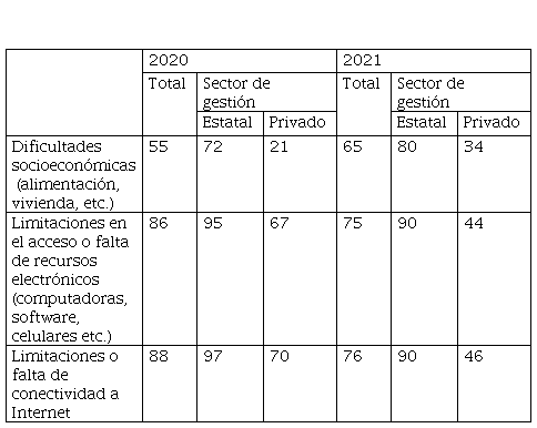 Cuando se observan las categorías sobre acceso a recursos electrónicos o conectividad a internet, aspectos que durante la pandemia adquirieron una significativa relevancia, las diferencias entre sectores son claras, tanto para la opinión de directivos cuanto de docentes, en detrimento de la situación de la población que asiste al sector estatal.