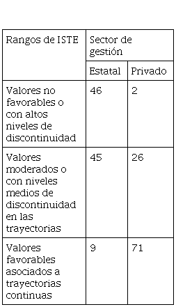 La distribución del ISTE según sector de gestión indica que del total de escuelas del sector estatal un 46% se clasifican con Valores no favorables o con altos niveles de discontinuidad de las trayectorias de sus estudiantes, y sólo un 9% con valores asociados a trayectorias continuas. En el caso de las escuelas privadas, 71% de estas posee valores asociados a trayectorias continuas y sólo un 2% a discontinuas.