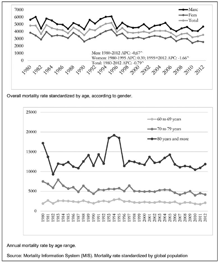 Data from the Mortality Information System (MIS)6, which consolidates all Brazilian deaths, were used. Deaths were coded according to the 9th revision of the International Classification of Diseases (ICD) for the years 1980 to 1995, and the 10th revision for the years 1996 to 2012.