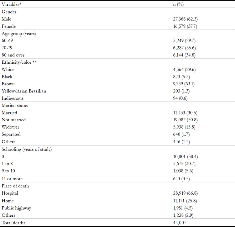 The absolute and relative frequencies of the following variables were analyzed: gender, age group (60 to 69 years, 70 to 79 years and 80 years or more); ethnicity/color (white, brown, black, yellow/Asian-Brazilian or indigenous); marital status (married, single, widowed, separated or other); schooling (zero, 1 to 8 years, 9 to 10 years and 11 years or more of study); place of death (hospital, home, public highway or other); cause of death, and year of death (from 1980 to 2012).