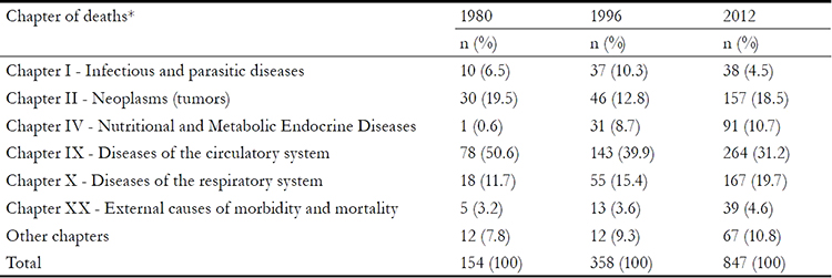 The distribution of deaths by ICD chapter, excluding ill-defined causes, revealed deaths from the circulatory disease chapter as the most frequent in elderly residents in Rio Branco during the studied period. Deaths in this chapter accounted for more than half of those recorded in 1980 (50.6%) and practically one third of those recorded in 2012 (31.2%). There was a change in the percentage of deaths due to diseases of the respiratory system, which were the second most prevalent in 2012, increasing from 11.7% of deaths in 1980 to 19.7%. There was an increase in the percentage of deaths in the endocrine, nutritional and metabolic diseases chapter (from 0.6% to 10.7%) and from external causes (from 3.2% to 4.6%). A different pattern was observed in the chapter on parasitic and infectious diseases, which showed an increase followed by a reduction: from 6.5% (1980) to 10.3% (in 1996) and 4.5% of elderly deaths in 2012 (Table 2).