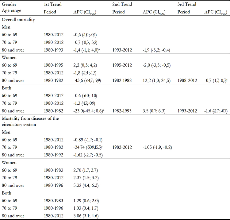 Table 3 also shows the predominance of a decline in mortality rates caused by CSD in men and women over the entire period. Analysis by age group revealed a difference in behavior, although overall there was an increasing trend, especially in the last age stratum (APC of 3.86; CI95% 3.1 to 4.6), despite the discrepancy in magnitude between the genders and age groups. The percentage of mortality due to CSD among elderly men aged 80 years or more declined by 1.62 per year from 1980 to 2012, while among elderly women there was an annual increase of 5.32 in the same period, both with statistical significance.