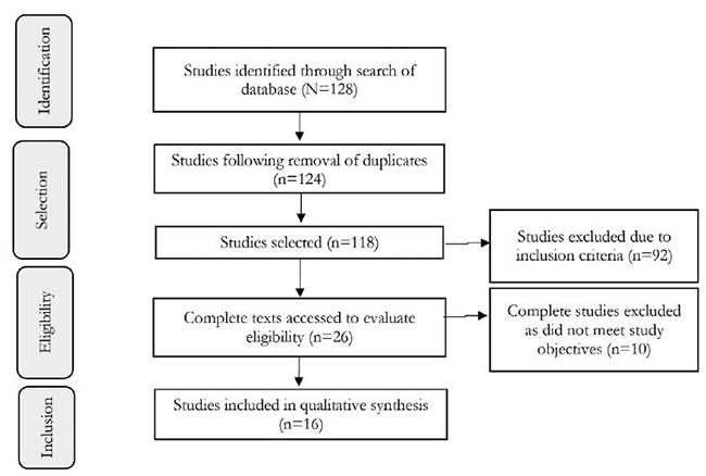 Firstly, two researchers independently evaluated the titles and abstracts of the publications in the database for the selection of potentially eligible studies. From these, full texts were obtained for a thorough reading. Afterwards, those that did not meet the inclusion criteria were excluded. The flowchart of the article selection process based on the PRISMA6 model is shown in Figure 1.