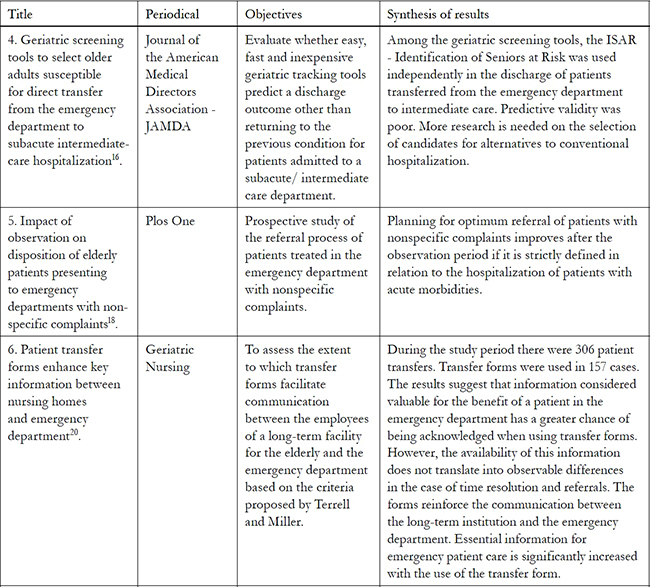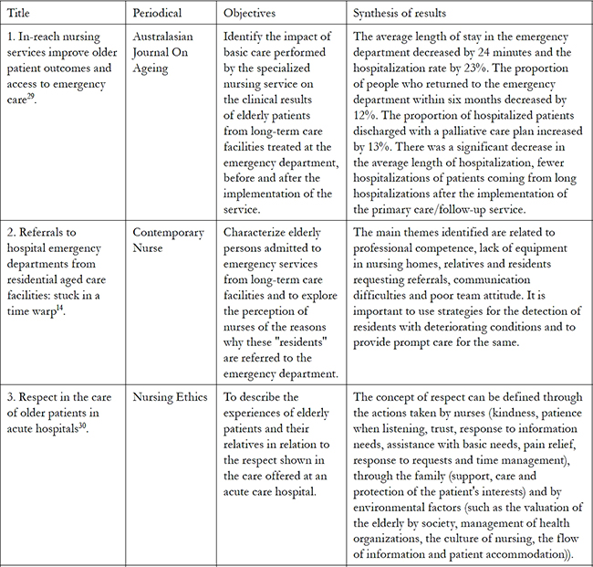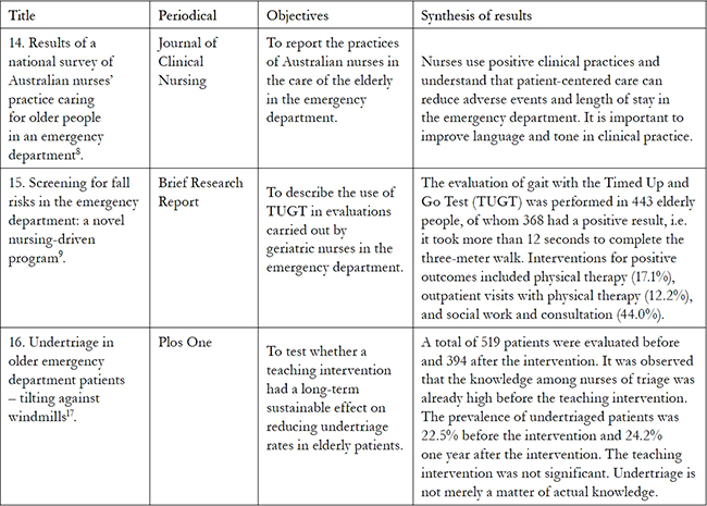 Results: Sixteen articles were analyzed in English, the majority of which had a qualitative approach (56.2%). Australia had the largest number of publications (31.2%). After reading the studies in full, the common themes were organized and classified into three categories: Challenges/difficulties in the care of the elderly in the emergency department, Positive experiences of elderly care in the emergency department and The emergency department as a space of death and dying.
