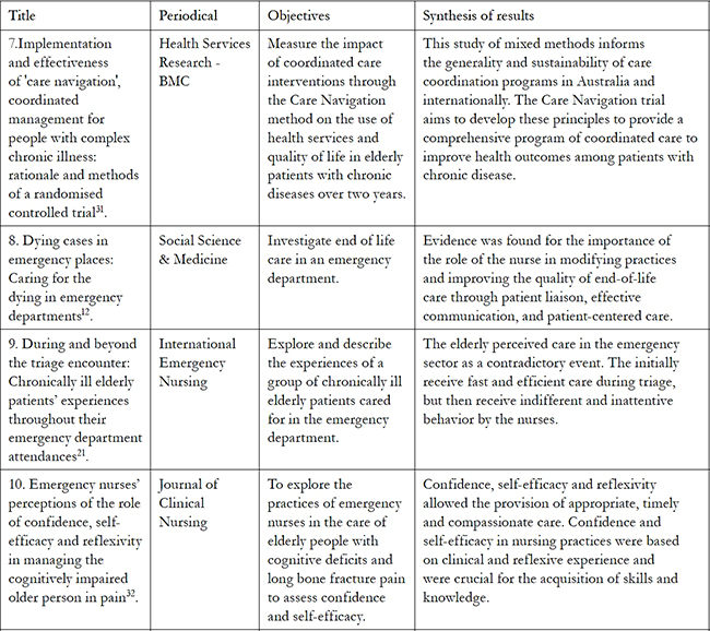 In the second stage the following inclusion criteria were established: complete articles in English, Portuguese and Spanish available online, published from January 2011 to September 2016, which addressed nursing care for the elderly treated in emergency departments. The exclusion criteria were: systematic, integrative reviews, case studies, reports of experiences and editorials.