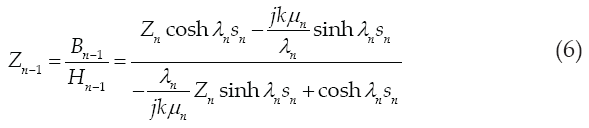 Las ecuaciones de campo anteriores relacionan las variables de campo B y H en uno de los límites o fronteras con el otro límite o frontera de la otra capa y pueden emplearse en cascada hacia arriba o hacia abajo para calcular todos los valores de las variables de campo en las fronteras a lo largo del modelo de capas mostrado en la figura 3 . La solución general empieza determinando las variables de campo en las capas de excitación (estator (8) e imanes (3)). Esto se facilita si se encuentran los valores de las impedancias superficiales de campo en las fronteras de la capa de excitación, las cuales se pueden obtener empleándose en cascada, a través de las capas, en las impedancias de superficie más externas (1) y (10), donde se asume que los campos decayeron a cero conforme Z tiende al infinito, usando las siguientes ecuaciones