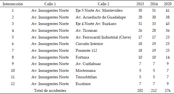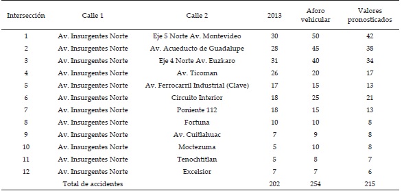 Respecto a los resultados del modelo de redes neuronales, los valores de las constantes de la ecuación se muestran en la Tabla 2 y el resultado del pronóstico en la Tabla 3. Revisando estas proyecciones podemos ver que el patrón de comportamiento es similar, es decir, donde existen actualmente la mayor cantidad de accidentes, al paso del tiempo mantendrán el mismo comportamiento y serán directamente proporcionales al flujo vehicular. Asimismo, proporciona el número de accidentes proyectados a través del tiempo a nivel de crucero, pero no permite entender el proceso, ni qué acciones se deben tomar de manera específica para su reducción.