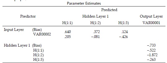 El segundo tipo de modelo se basó en redes neuronales, que son la herramienta preferida para muchas aplicaciones de minería de datos, es predictiva por su potencia, flexibilidad y facilidad de uso. Una de las definiciones más certeras es que las redes neuronales “son conjuntos de elementos de cálculos simples, usualmente adaptativos, interconectados masivamente en paralelo y con una organización jerárquica que les permite interactuar con algún sistema, del mismo modo que lo hace el sistema nervioso biológico›› (Anderson, 2007). El uso de redes neuronales nos permitió proyectar a futuro los accidentes de tránsito y el lugar donde sucedieron, ello a través de una ecuación donde la ventaja es que imita el patrón de comportamiento de las variables independientes o predictoras, que en este caso, fueron el número de accidentes históricos y el flujo vehicular que se presentaron en los cruces de la avenida en estudio. Se obtuvo utilizando el software SPSS (2007), asimismo, el tipo de red neuronal que se utilizó fue de tipo perceptron multicapa, que permitió simular comportamientos que no son lineales, es decir, permite reproducir patrones definidos que muestran los datos (Mejía, 2004), este generó un modelo predictivo para una variable dependiente para los accidentes de tránsito.