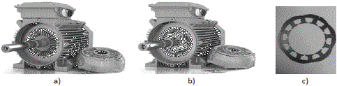 El SynRM usualmente se constituye por un núcleo de material ferromagnético en el estator con el mismo tipo de láminas que en el IM. Incluso, se puede usar el mismo estator para ahorrar inversión. Esto se puede observar en las Figuras 1a y b. En la Figura 1c se muestra una lámina de un estator.