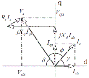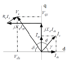 Vs= tensión en el estator (V)Vds y Vqs= proyecciones de la tensión Vs sobre los ejes d y q, respectivamente (V)Is= corriente en el estator (A)Ids e Iqs= proyecciones de la corriente Is sobre los ejes d y q, respectivamente (A)Rs= resistencia del estator (W)Xq y Xd= reactancias en el eje q y d, respectivamente (W)Φ = ángulo de factor de potencia (rad)Las ecuaciones de tensión se expresan en las ecuaciones (2) y (3):