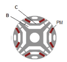En la Figura 5 se muestra un esquema de este tipo de motor, con una determinada colocación, número, material magnético y dimensiones de los imanes, donde PM indica los imanes permanentes, C las costillas (segmento de material ferromagnético) y B, las barreras de flujo (constituidas por aire) (Niazi y Toliat, 2007).