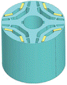 En cuanto al rotor, en la Figura 2a, se muestra un esquema de la estructura de una lámina tipo transversal; y en la 2b se observa el rotor con las láminas transversales montadas, mostrando cómo estas, en forma de disco, están apiladas y centradas en el árbol del rotor. Esta configuración se utiliza por su mayor facilidad constructiva. En la Figura 2c, se puede ver un esquema de la estructura de una lámina tipo axial, y en la 2d un rotor con las láminas axiales montadas. Con esta disposición las láminas axiales se apilan en dirección radial para formar cada polo. Como se puede observar, las láminas tienen dimensiones diferentes (Vartanian et al., 2012; Hendershot, 2012).