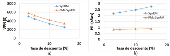 Los autores realizaron un análisis económico utilizando técnicas de descuento (VPN diferencial y PRI), en una empresa industrial cubana, para determinar los ahorros de una sustitución de un conjunto AFV-IM por uno AFV- PMa-SynRM. El sistema trabaja 3 turnos diarios. Se demostró que con el AFV- PMa-SynRM se logra un ahorro importante: el VPN aumenta de 2553 USD con el primero a 3426 USD con el propuesto. El PRI disminuye de 2.75 años a 0.97 años. Un peso importante en los ahorros lo tiene la reducción del costo de AFV, de 1663 USD a 581 USD, debido a la disminución de la corriente. La rentabilidad de las propuestas para ambos conjuntos se encuentra en rangos aceptables ante variaciones de la tasa de descuento y la tasa de inflación.