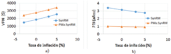 De acuerdo con lo que se expresó en la introducción, en el caso de la Tabla 4, los datos de eficiencia y factor de potencia se han extrapolado del SynRM y de otros motores PMa-SynRM de pequeña potencia existentes en el mercado. Un análisis de sensibilidad demostró que una pequeña variación de la eficiencia y del factor de potencia, no tienen un peso importante en los resultados, ya que predominan los costos iniciales, el consumo de energía y el tiempo de operación. Además, se verificó que coincidían con los intervalos planteados en Spargo (2014).