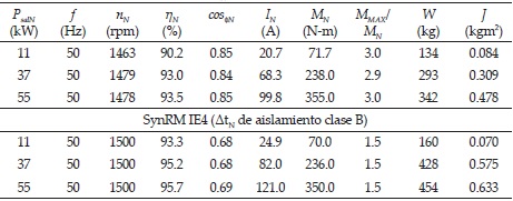 En la Tabla 1 se muestra una comparación de las características de dos motores, diseñados para la aplicación con cargas centrifugas (bombas y ventiladores), a flujo variable. Se observa el hecho de que el cosφN es bastante inferior en el SynRM respecto al IM; y la eficiencia es mayor (Eficiencia en motores IE4 Super Premium y SynRM IE4-ABB, 2013 y Synchronous reluctance motor-drive package for machine builders. High performance for ultimate machine design, ABB Drives, 2013).