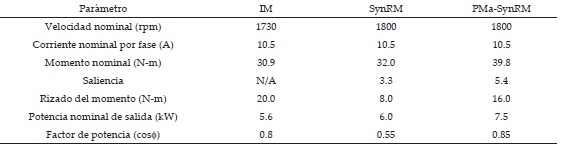 En la Tabla 2 se muestra la comparación de algunos parámetros nominales de estas tres máquinas. La comparación se hace para la misma corriente nominal del estator del IM para mantener las pérdidas de cobre de las tres máquinas iguales y asegurarse que los devanados están adecuadamente cargados.