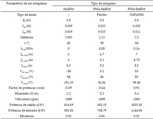 La Tabla 3 muestra los resultados comparativos entre un SynRM, un PMa-SynRM con imán de ferrita y otro del mismo tipo, pero con un imán de tierras raras (NdFe35H) (Vartanian et al., 2012). Los valores de las corrientes y de las tensiones, a partir del diagrama de la Figura 6, son valores máximos. Los autores calcularon valores que se añadieron en la Tabla 3. La comparación se realiza para un valor máximo de (Is max ) de 8.5 A para los tres motores (Isrms = 6 A). Se puede observar el aumento del factor de potencia, la eficiencia, la potencia de salida y el momento siguiendo el orden mencionado arriba. Deben reiterarse las diferencias en costos entre ambos tipos de imanes y en cuestiones operacionales entre ambos tipos de máquina.