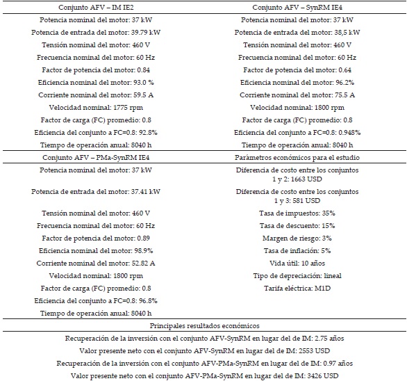 En la Tabla 4, se dan los parámetros fundamentales para el estudio (ABB Motors and Generators, 2013; ABB Drives (Catalogue), 2013), incluyendo los parámetros económicos.