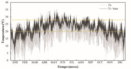 Con el fin de demostrar que el consumo energético de una edificación se puede reducir al realizar la selección de materiales, aun con disponibilidad limitada de ellos, se realizó el análisis detallado del comportamiento térmico a través de simulaciones dinámicas, presentándose el requerimiento energético de los sistemas de calefacción y refrigeración de un edificio de tres plantas y 5500 m2 de superficie. De acuerdo con la evaluación del comportamiento de temperaturas dentro del edificio base mostrado en la Figura 2, se decidió evaluar los siguientes componentes constructivos: cubierta (impermeabilizante), muros y acristalado. En la Figura 2, se grafican las temperaturas interior (Ti) y ambiental (Ta), obteniéndose Ti promedio, mínima y máxima anuales de 22.5, 4.5 y 33.4°C, respectivamente, mientras que las Ta promedio, mínima y máxima anuales fueron de 18.5, -3.8 y 35.3°C. En el año típico analizado se encontró que durante un total de 2070 horas al año se tendrán condiciones fuera del rango de confort establecido, por lo que se requerirá del uso de los sistemas de climatización.