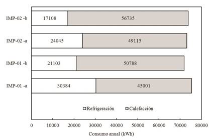 Para el análisis de cubierta (Figura 3), se seleccionaron dos impermeabilizantes: color terracota y color blanco con propiedades reflectivas. Además se consideraron dos condiciones de sombreado en los lucernarios, debido a que estos representan pérdidas y ganancias de calor significativas. En la Figura 3, las claves (a) y (b) en el análisis de cubierta, se refieren a lucernarios sin sombreado y con sombreado, respectivamente. En la comparación de energía requerida los casos IMP-b (con sombreado) son efectivos para la reducción del requerimiento de energía para refrigerar, reduciéndose hasta un 31 y 44% la demanda cuando se compara contra los casos IMP-a (sin sombreado). Sin embargo, la medida resulta contraproducente al examinar los consumos por calefacción, donde la misma medida que ahorra 44% de energía, requiere 26% más energía que el caso base (IMP-01-a: sin sombreado e impermeabilizante terracota). Al realizar la suma anual de los consumos, se observa que para esta configuración de edificio y clima la estrategia que funciona mejor es IMP-01-b: con sombreado e impermeabilizante terracota), el cual disminuirá hasta 4.63% el consumo de energía del edificio.