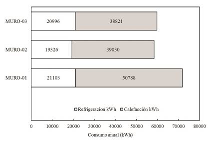 Para el análisis de muros (Figura 4), el sistema constructivo que resultaría en un menor consumo energético es el MURO-02: (bloque de concreto y poliestireno). Este sistema reduce 18.8% el consumo energético anual. Este sistema resulta efectivo especialmente para la reducción de la demanda energética por calefacción, con una reducción de 23% de la demanda prevista. Esta mejora se debe principalmente a la inclusión del material aislante (poliestireno, k=0.17 W/m K) en el sistema constructivo. Por lo que este sistema reduciría de manera importante las pérdidas de calor a través de la envolvente del edificio en los meses fríos.