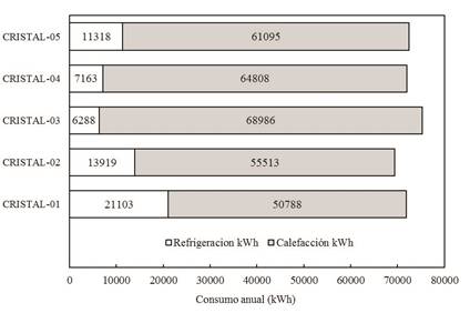 Por último, se analizaron cinco sistemas de acristalado (Figura 5), donde todos resultan favorables para la reducción del flujo de calor al interior del edificio. Sin embargo, al cuantificar el consumo de energía correspondiente a calefacción se observa que todos los sistemas analizados consumen más energía respecto al sistema de acristalado convencional, esto principalmente a los valores bajos del coeficiente de ganancia de calor solar (SHGC) que poseen los demás cristales. Un alto coeficiente SHGC, nos indica que el cristal permitirá mayores ganancias de calor, mientras que un coeficiente bajo, permitirá poco flujo de calor. En el caso del sistema convencional, este tiene un coeficiente de 0.855, indicando mayores ganancias de calor, lo cual se traducirá en una demanda de calefacción menor. El sistema CRISTAL-03, tiene un SHGC menor (0.472), observándose que es el sistema que tendría mayor demanda de calefacción (68986 kWh). Cuando se realiza un balance de consumo anual de ambos requerimientos (refrigeración y calefacción), el sistema CRISTAL-02 (Cristal claro) logra reducir en 3.4% la demanda energética anual respecto al caso base, CRISTAL-01(Cristal convencional).