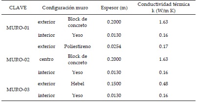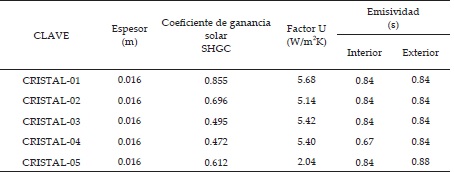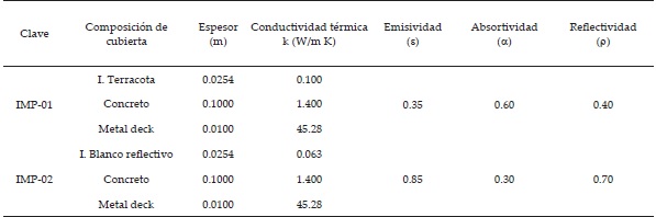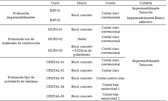 Un sistema constructivo es un conjunto de materiales característicos para un tipo de construcción. Actualmente el sistema constructivo tradicional se refiere al proceso constructivo cuyo objetivo es la realización de muros de ladrillo, piedra, bloques u hormigón armado. En este trabajo se implementaron los sistemas constructivos y corridas de simulación para conocer el comportamiento térmico y energético del edificio, las cuales se detallan en la Tabla 1, en donde se observa que se evaluará el efecto que tiene la selección de impermeabilizante sobre la cubierta, del sistema constructivo de muros y de los cristales de las ventanas. Las propiedades térmicas y ópticas de los diferentes impermeabilizantes, muros y cristales utilizados se detallan en las Tablas 2, 3 y 4, respectivamente.