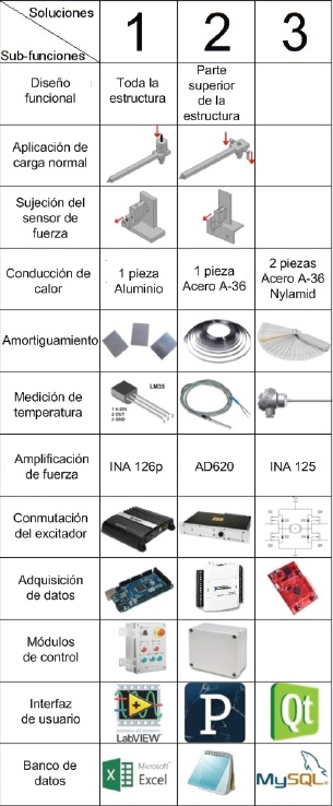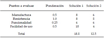 Para evaluar las alternativas de solución, se emplearon tablas comparativas para cada una de las sub-funciones de la Tabla 2. Como ejemplo, se muestra en la Tabla 3 la evaluación de la sub-función: Aplicación de carga normal.