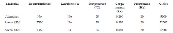 Para las pruebas experimentales, se analizaron dos tipos de materiales: Aluminio y acero AISI 4320 con recubrimiento de nitruro de titanio (TiN). Las probetas empleadas en forma de disco, tienen 20 mm de diámetro y 4 mm de espesor. Se utilizó una distancia de deslizamiento de 3 mm para el contacto entre la bola y el disco. El material de la bola es AISI 52100 con un módulo de elasticidad de 200 GPa, dureza 60 HRC, resistencia a fluencia de 520 MPa y una resistencia a la tensión de 1200 MPa. La Figura 18a muestra una prueba con lubricación y la Figura 18b muestra la interacción entre la HMI y la máquina reciprocante.