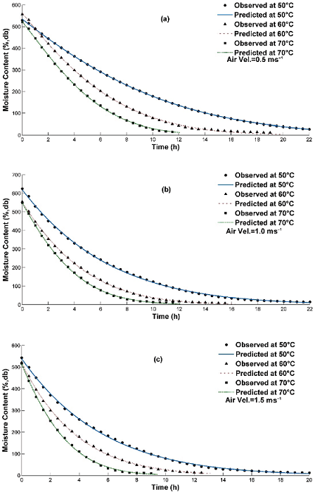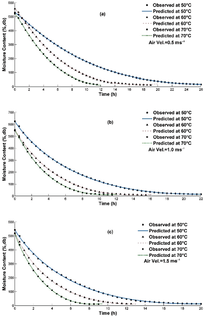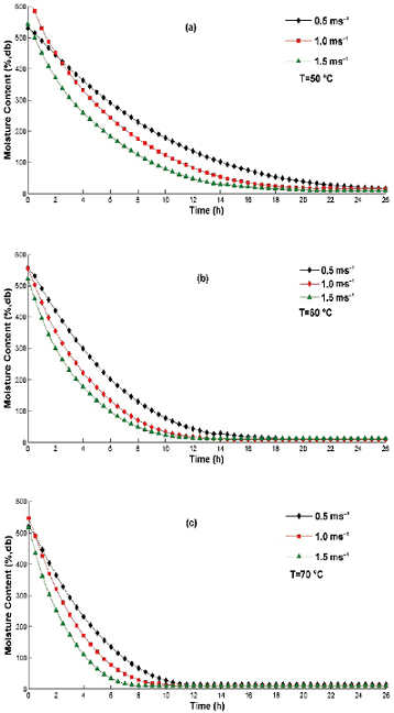 Figure 2 shows drying effect in moisture content at different combinations of drying air temperature with constant air velocity. Final moisture content under different conditions resulted to be bounded from 8.54% to 15.53% (db.). By comparing Figures 2a, 2b and 2c it can be seen that minimum final moisture content depends, to certain extent, on higher drying rate and hotter temperatures. Moreover, it can be noticed, for each applied temperature, that the higher the air velocity is, so the initial rate is. Figure 3 shows the existent relationship between moisture content reductions with the applied air flow in the range of 0.5 ms-1 to 1.5 ms-1. By comparing Figures 3a, 3b and 3c it can be observed that the greater air flows are, the rate of pineapple drying increases. Thus, from 50 to 70°C at 0.5 ms-1 drying time decreased from 26 to 12 hours; similarly with higher air flow rates, from 50 to 70°C at 1.0 ms-1 drying time decreased from 20 to 10 hours and from 50 to 70°C at 1.5 ms-1 drying time decreased from 16 to 8 hours.