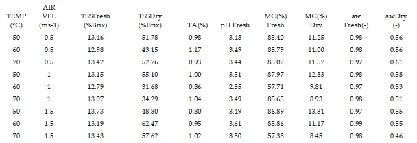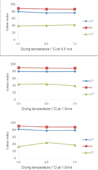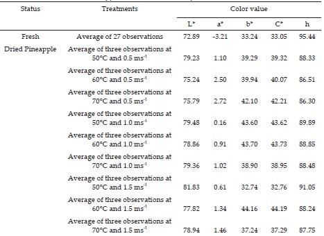 Table 4 describes the variations in color for both fresh and dried slices in relation with temperature and air velocity; this change of color is due to the evaporation of the water in the fruit. Figure 7 shows the drying temperature influence on pineapple color indices. From Table 4 and Figure 7 is observed that the lightness value is higher in dried pineapple compared with the one of fresh pineapple. Redness and yellowness do not increased significantly, which means that yellow color varied in a meagre extent. The Chroma (C*) reacted in the same way as redness and yellowness (negligible change) indicating that any color saturation took place. Hue angles (h) of dried pineapple decreased no more than 8 units evidencing that color moves around red and yellow resulting in a scant presence of brown color on the dried pineapple. For this reason, there is not a significant change in the color indexes when the pineapple are dried at 50°C, 60°C and 70°C. These temperatures are suitable for drying pineapple in slices.