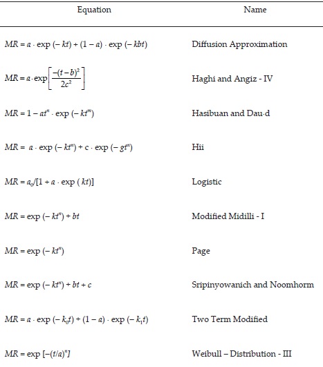 The drying curves generated by data coming from the High Precision lab-scale dryer at Hohenheim, were fitted with ten empirical and semi theoretical thin-layer drying models (Table 1) suggested by (Ertekin and Firat, 2015). These equations were chosen since they have shown better fit behaviour for this category of drying experiments (Togrul and Pehlivan, 2002; Koua et al., 2009; Janjai et al., 2011)The models were selected from a total of 26 discarding the ones with large Root Mean Square Error (RMSE). The constants estimation and RMSE with nonlinear regression was performed using MatLab® (Version R2013b).