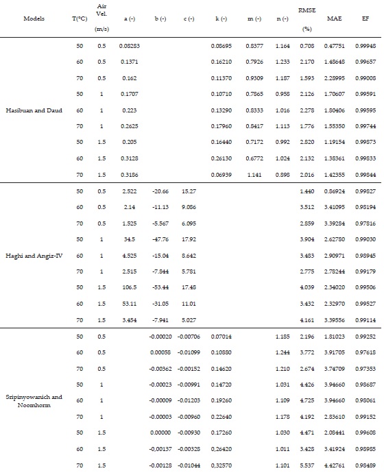 Moisture ratios of dried pineapples at different temperature and air velocity were fitted with three thin layer models. Parameter values of the models and the statistics RMSE, MAE and EF are shown in Table 2. Hasibuan and Daud model was the best, followed by Haghi and Angiz IV’s and Sripinyowanich and Noomhorm’s. For these three cases the value of RMSE was less than 5.6% indicating a good fit. The average value of RMSE for the Hasibuan and Daud model was 1.96%, MAE was 1.48 and EF= 0.99.