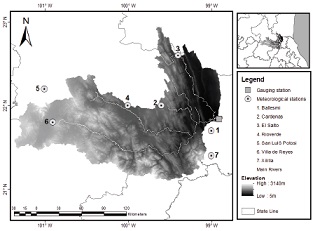 The study catchment is the Tampaon River Basin located in east-central Mexico (Figure 2), which covers an area of 23 373 km2 (IMTA, 2016). The east part of the basin is located in the Sierra Madre Oriental mountain chain, which provides an orographic barrier to the Oceans’ precipitation that leads to a variety of climatic regions within the basin: the east region presents a tropical Savannah (Aw) and tropical monsoon (Am) climate types; the central region has a temperate dry winter hot summer (Cwa) climate type and the west region presents an arid cold steppe (BSk) climate type (Peel et al., 2007).