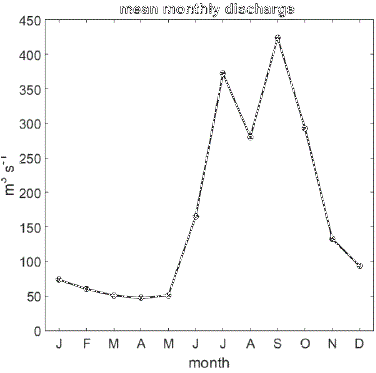 The discharge data were obtained from the National Database of Surface Water (IMTA, 2016) for the 1971-2000 period. These data come from the gauging station El Pujal (I.D. 26272), located downstream the Valles River. The gauging station drains the Tampaon River basin, whose farthest headwater is the Santa Maria River. This river flows west to east and its junction with the Verde River makes the start of the Tampaon River. From here, the Tampaon River flows to the northeast to join the Gallinas River and the Valles River (Velázquez et al., 2015). Figure 3 shows that the Tampaon River Basin presents two peak flows in July and September.