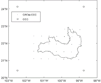 An estimation of the natural variability is given by the 5-member ensemble, which was obtained by repeating the climate change experiment using the climate model with changes in the initial conditions induced by small perturbations (Murphy et al., 2009). Periods 19712000 and 2046-2065 were selected for this study given the data availability for both climate models. Figure 4 shows the grid points considered in evaluating the climate change impact on the study basin for both the regional and the global climate model.