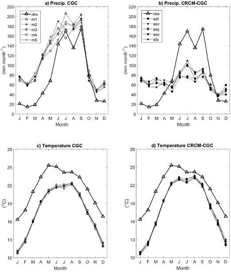 Regarding the mean monthly temperature, Figures 5c and 5d show the observed annual cycle with a minimum on January (16.3°C) and a maximum on May (25.1°C). The bias in temperature is comparable in both climate models; that is, a general underestimation with values of about -5.5°C in January and from -0.8°C to -1.9°C in August. We can say that, despite the higher resolution, the regional climate model did not reduce the systematic bias of the global climate model simulations.
